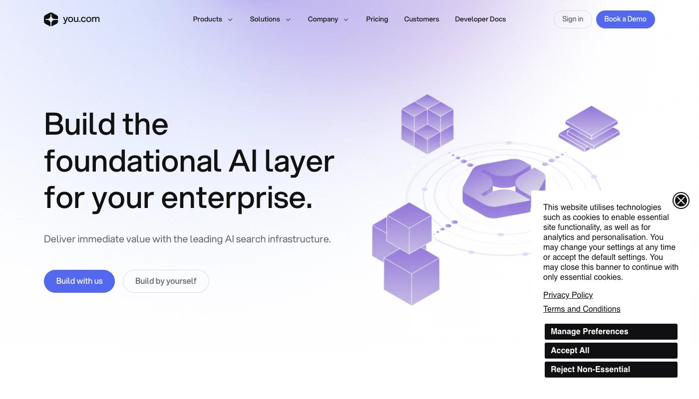 You.com: An AI-powered search engine that lets users customize their search experience and choose between different AI modes. Now pivoting toward enterprise AI search infrastructure.